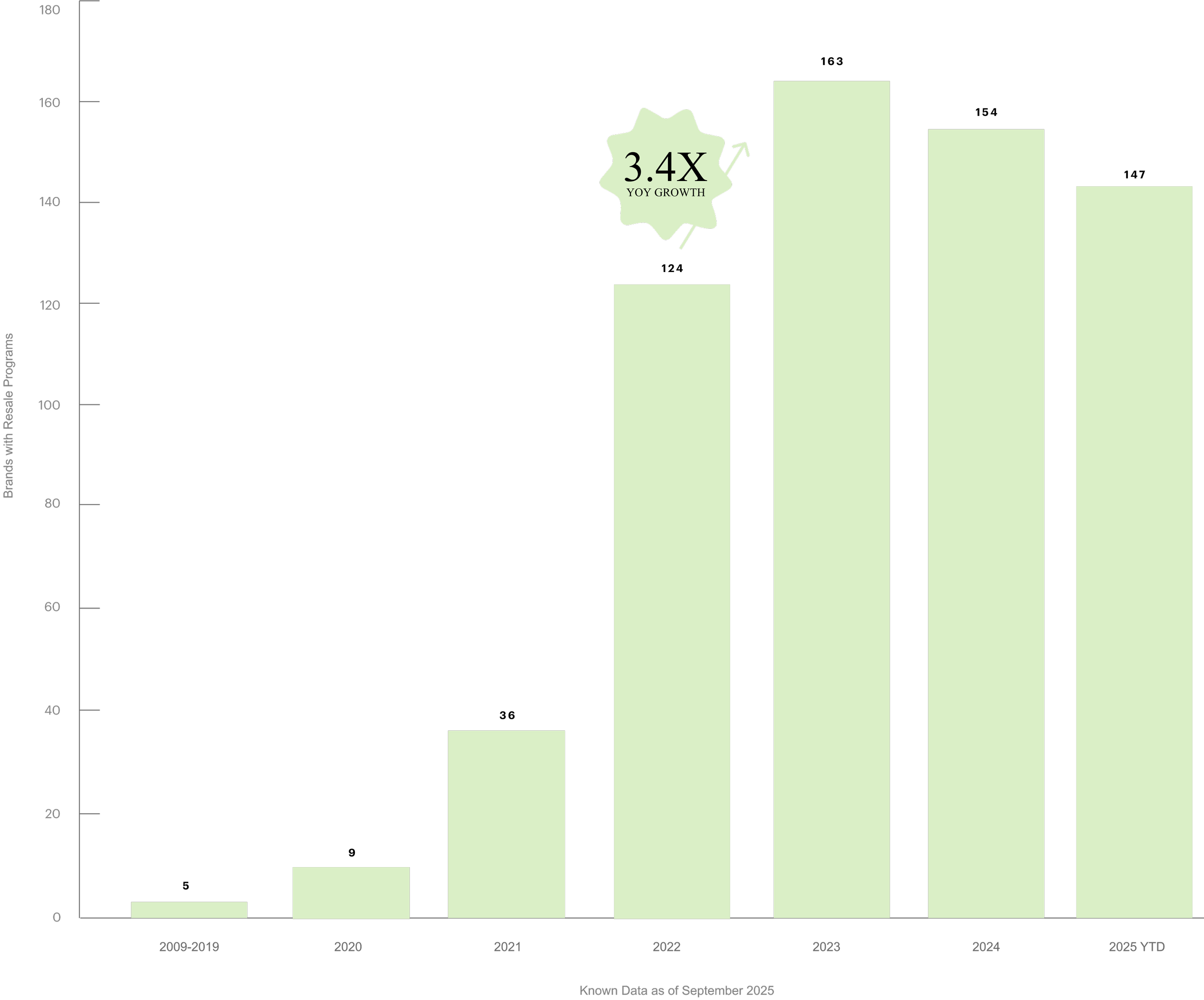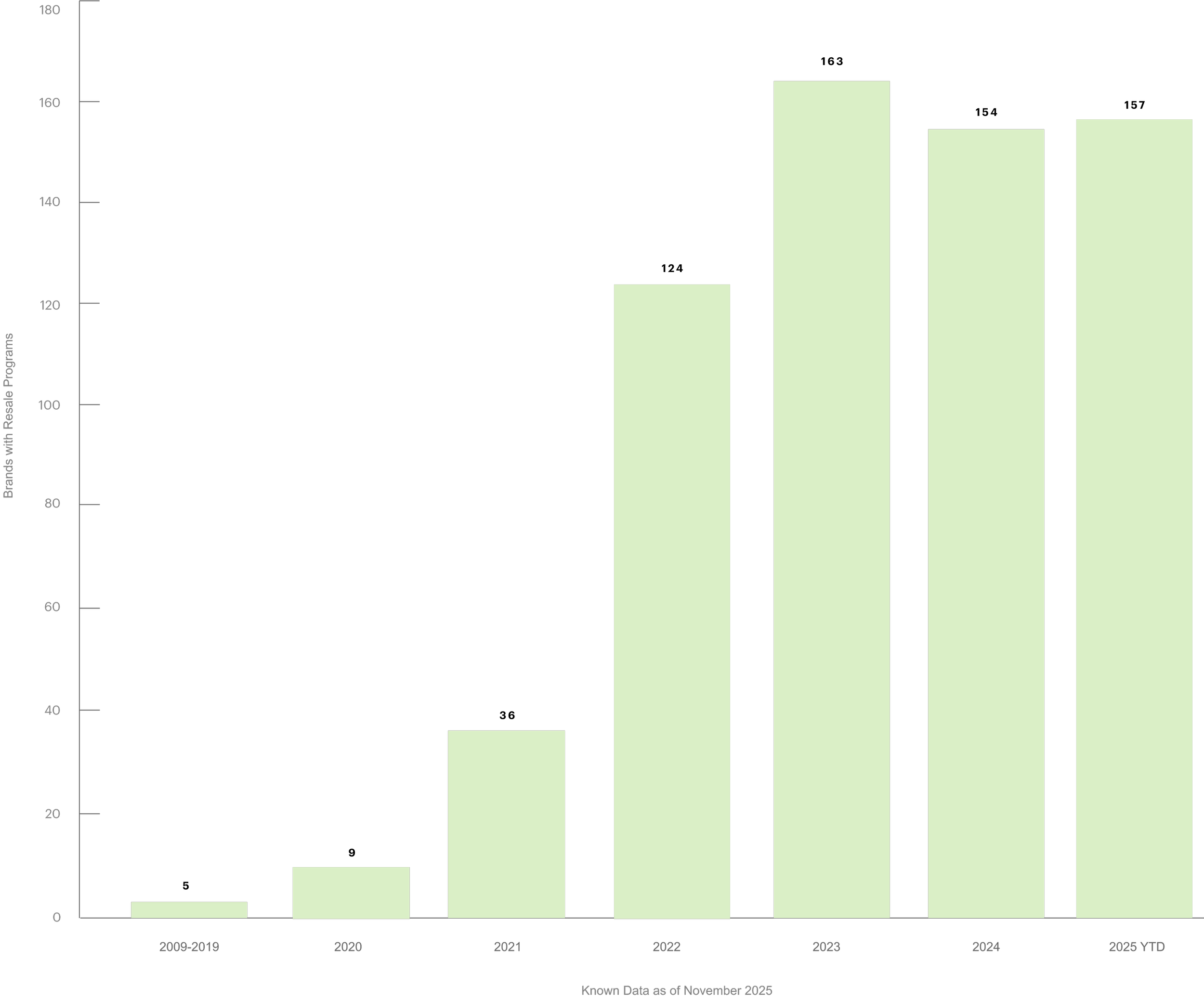 Resale shop launch year is compiled based on publicly available information from sources including statements on brand websites, media coverage, brand social media posts or inquiries to brands’ customer service.
